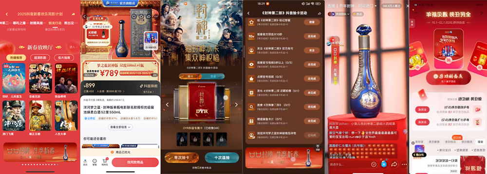 在全面引爆声量的同时,洋河梦之蓝结合抖音话题页下拉跳转至电商页面、发布页添加话题、品牌榜banner,以及春节档活动页资源,形成生态共振,进一步推动“梦之蓝封神版”联名产品从用户触达、产品种草到销售转化。期间,电影抽小卡任务上线首周曝光571w+,品牌植入任务完成数达22.5w+,片方主话题banner跳转品牌x封神H5曝光达12w+。此外,在抖音&影视共创直播中,直播前开屏海报宣推植入品牌logo,开屏总曝光达10w+,电影宣发直播曝光达1486w+,通过高效引流,助力品牌实现品效双收。