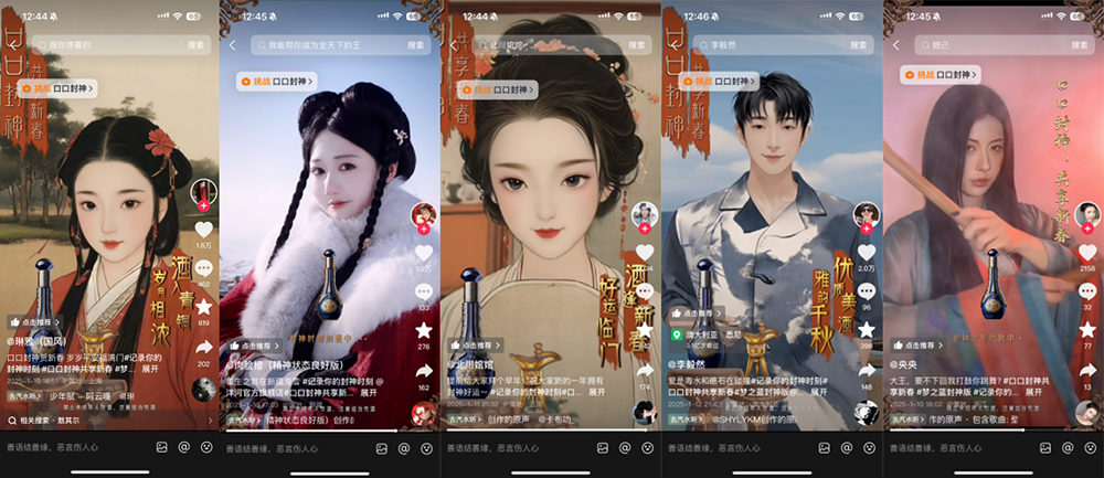 结合电影宣发和上映节奏,1月9日,洋河梦之蓝在抖音发起#记录你的封神时刻 挑战赛,话题页同步绑定全民任务,通过定制化的品牌AIGC贴纸——在画面中解锁属于自己的国风“封神”形象,成功激发用户创作热情,吸引了海量年轻人积极自发参与投稿。