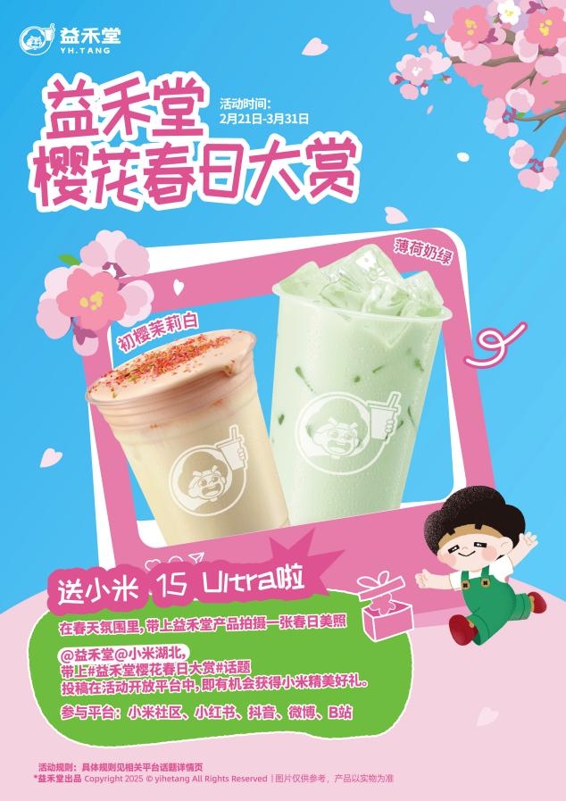 同时,2月27日至3月9日,从微信、支付宝小程序进入购买指定套餐(双杯)立享88折。周二会员日(3月4日、3月11日)则提供了更多优惠选择,让消费者以更低的价格享受到益禾堂的美味饮品,仅限周二当天有效。不仅如此,益禾堂还与小米联动,发起#益禾堂樱花春日大赏#话题,在小米社区、小红书、抖音、微博、B站任意一平台带上益禾堂产品拍摄一张春日美照就有机会获得小米15 Ultra。