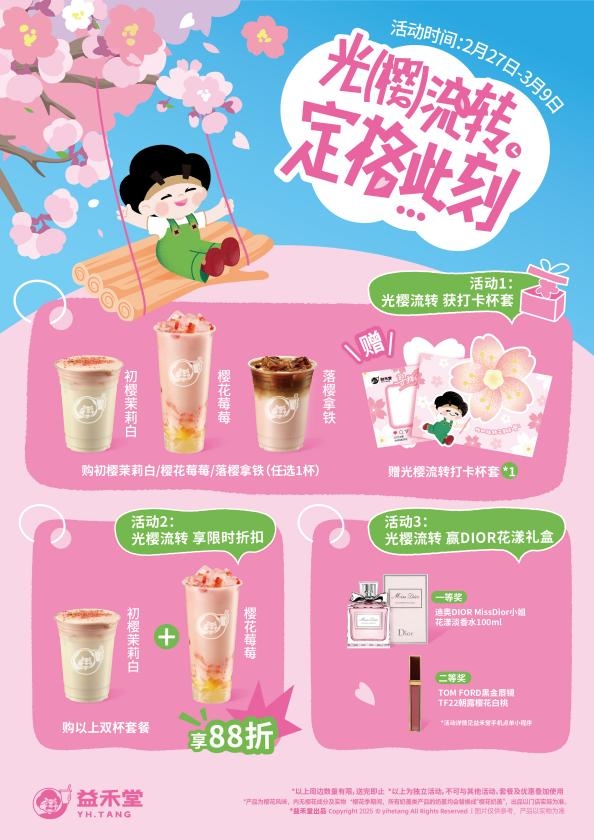除了新品外,益禾堂同样准备了丰富的互动活动。线上,从2月27日至3月9日,消费者可以通过益禾堂小程序参与樱花转盘活动《光樱流转,赢DIOR花漾礼盒》,使用9积分即可参与一次樱花转盘,抽取精美奖品。奖品涵盖迪奥DIOR小姐花漾美肌礼盒、TOM FORD黑金唇镜TF22朝露樱花白桃、益禾堂12周年纪念礼盒、益禾堂新品79折券、满减券以及积分奖励。让消费者喝得开心,玩得开心。