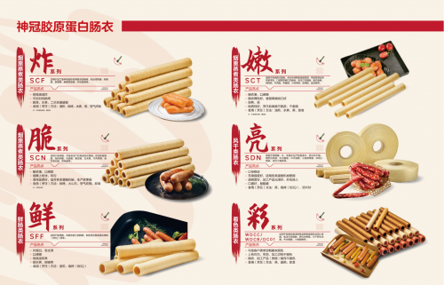 本次展出的“炸、嫩、脆、亮、鲜、彩”六大肠衣系列,覆盖烟熏蒸煮、风干、鲜肠、着色肠衣等全场景应用需求,囊括市面上所有香肠,包括火山肠、烤肠、广式腊肠、烟熏香肠、哈尔滨红肠等,其肠衣壁厚均匀、充填强度高、透明度好、口感好、烟熏上色均匀、有光泽,可定制化个性需求的肠衣高品质特性,适配10-50mm多种口径,满足全球肠衣领域的多元化市场需求: