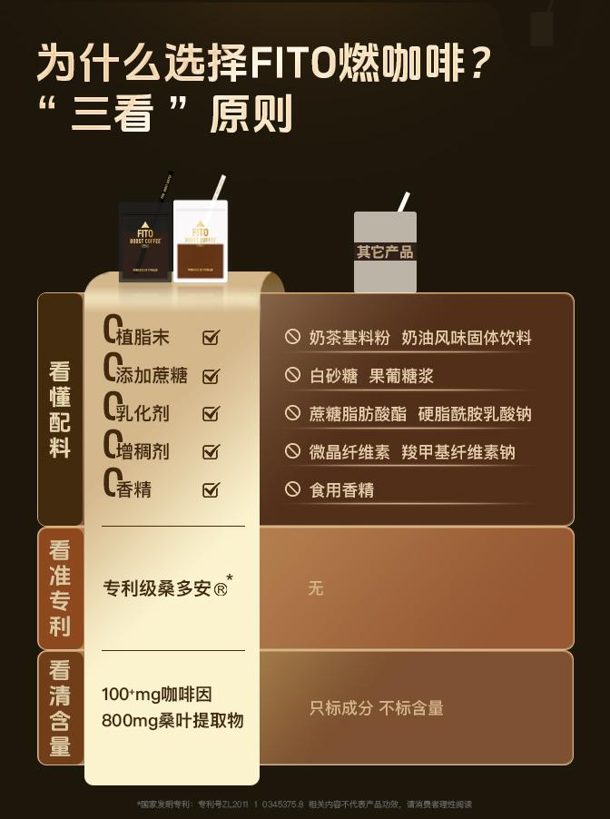 作为权威咨询机构认证的“中国燃咖啡开创者”,FITO燃咖啡一经上市就以其高品质配方和显著的饮用效果受到了一众消费者的青睐。一时间,“燃”成了咖啡市场上的热门关键词,迅速推动了功能性咖啡这一细分市场的发展,同时也引来不少跟风者。
