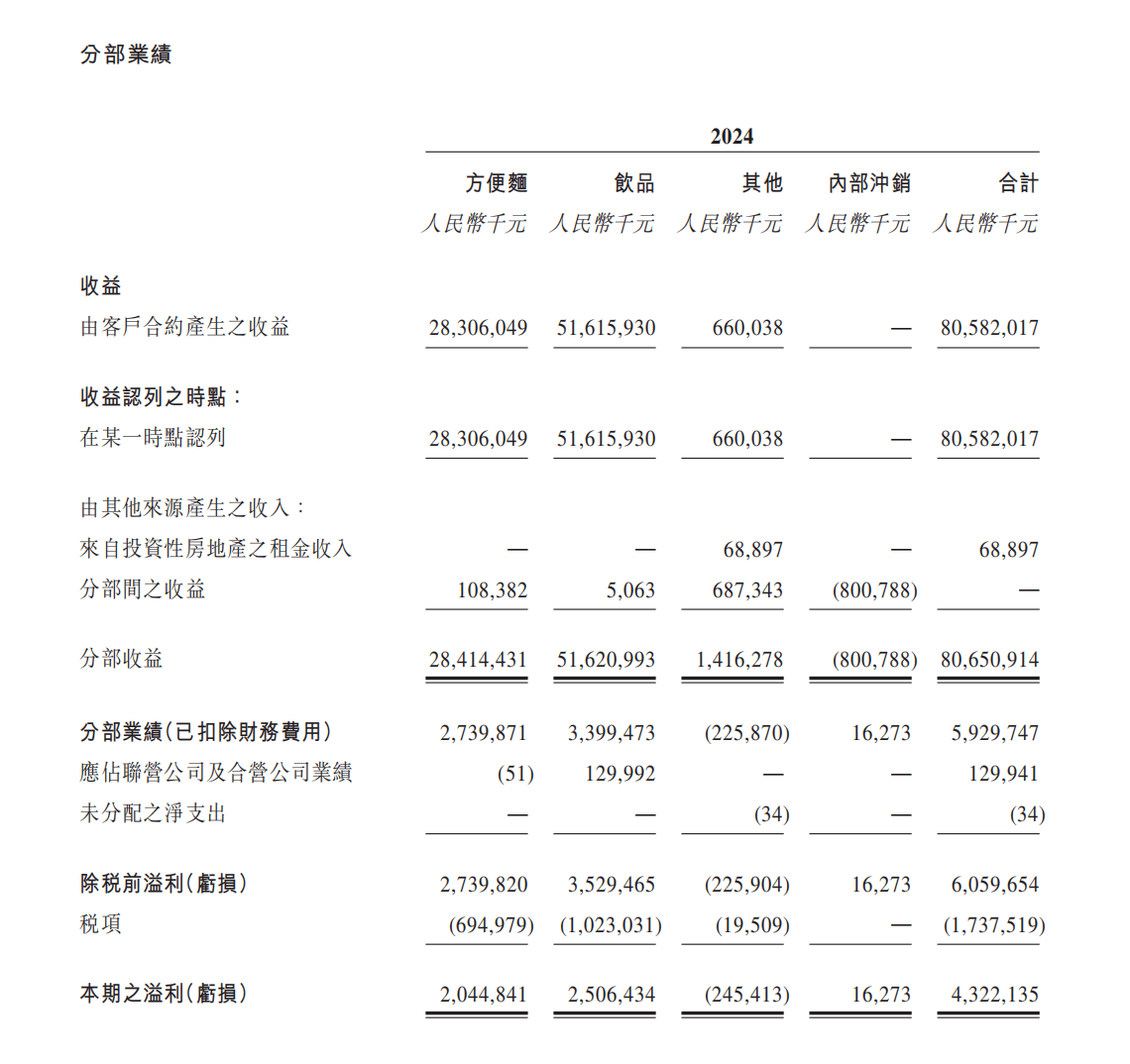 3月24日,康师傅披露2024年业绩。报告期内,公司实现营业收入约806.5亿元,同比增长0.3%。其中,方便面板块营收284.14亿元,占集团总收益35.2%。