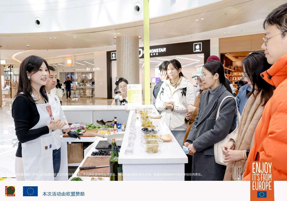 北辰荟购物中心一楼西二门附近的欧洲橄榄快闪店为本次活动增添了浓厚的互动体验氛围。快闪店内不仅陈列了多款原味、调味及夹心橄榄产品,供消费者现场选购和试吃,还安排了专业西餐主厨在3月29、30日以及4月5、6日到现场展示橄榄美食的制作过程。现场主厨利用各类橄榄烹制出风味独特的创意料理,通过现场讲解和示范,让消费者直观了解西班牙橄榄在西餐中的广泛应用,使消费者不仅能够体验到橄榄的美味,还能感受到地中海饮食文化的精髓。