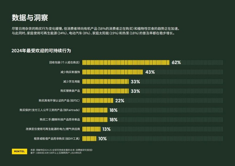 令人欣喜的是,消费者也以更多元、更主动的方式拥抱可持续。据英敏特发布的《2024-25全球可持续发展的未来:消费者研究报告》显示,尽管日用杂货的购买行为变化缓慢,但消费者转向有机产品(58%的消费者正在购买)和植物性饮食的趋势正在加速。与此同时,家庭使用可再生能源、电动汽车、家庭太阳能和热泵的普及率都在稳步增长。
