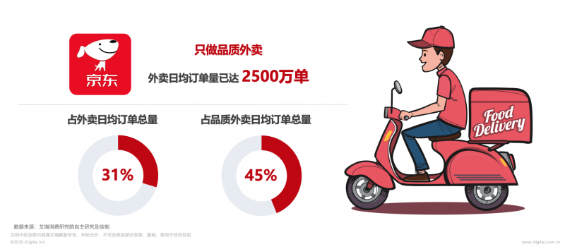 这一系列举措不仅赢得了消费者的广泛认可,更引领了外卖行业向品质化、健康化方向转型升级。艾瑞咨询最新报告显示,京东外卖上线仅百天,日均订单量就突破2500万单,占据全国外卖市场31%的份额。在品质外卖这一细分领域,京东更以45%的市场占有率位居行业前列,充分验证了品质升级的市场潜力。