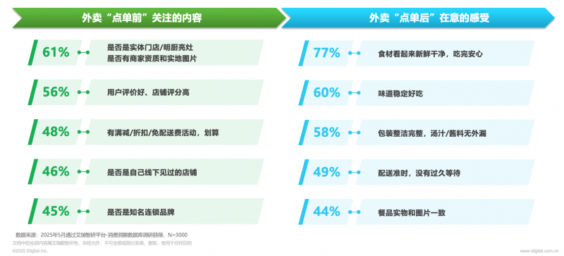 随着外卖消费成为都市生活的刚需,行业乱象与食品安全问题持续引发公众关注。艾瑞调研显示,七成消费者在点外卖时存在“品质焦虑”,其中卫生、口感和健康构成三大核心痛点。眼下,这种焦虑正重塑消费决策逻辑,调研显示,62%的用户将“拥有实体门店”列为首选标准,同时通过“明厨亮灶”直播、商家资质公示、实地照片比对及真实用户评价构建多维筛选体系,反映出消费者从“便捷优先”向“安全可控”的消费理念升级。
