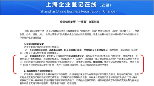 “上海企业登记在线”食品经营许可“免申即享”告知页面