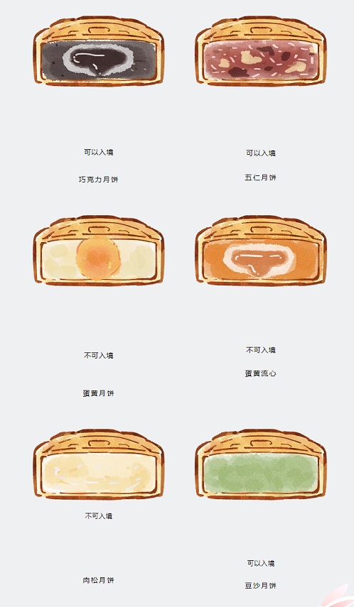 因此色香味美的鲜肉月饼、云腿月饼、肉松月饼、叉烧月饼等不可以入境。