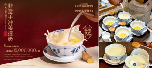 姜撞奶(Ginger Milk Pudding),又称姜汁奶,是一款发源于广东珠江三角地区的传统甜品。作为中国南方地区独具特色的传统新鲜奶酪制品,姜撞奶以其香醇柔滑、甜中带辛的口感,并具有暖胃驱寒等功效,深受当地民众的喜爱,是广式糖水中极具代表性的一道美味。为了能让更多地域的消费者都能体验到姜撞奶的独特魅力,深耕糖水领域十年的赵记传承,率先对传统工艺进行创新升级,成功优化改良了姜撞奶的手冲制作技艺,通过【刮】-【锤】-【榨】-【煮】-【冲】五大步骤,搭配每日精选的新鲜食材,匠心研制出契合多数中国人口味、符合当代人饮食观念的新一代手冲姜撞奶。这款新品一经推出便广受好评,不仅连续9年蝉联销冠,一年更是能卖出15000000+份。不仅如此,赵记传承的独特制作技艺还正式列入“非物质文化遗产代表性项目名录”,让众多食客实现一碗“入坑”。