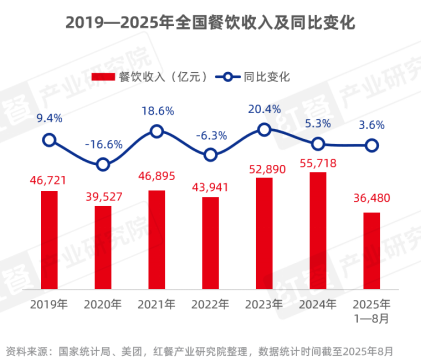 当前,餐饮行业面临增速放缓、存量激增、成本高企三重压力。国家统计局数据显示,2025年1 - 8月全国餐饮收入3.6万亿元,同比增长3.6%,增速较2024年同期降3个百分点,行业进入低增长周期。红餐大数据显示,截至2025年8月,全国餐饮门店超760万家,市场饱和度逼近临界点。成本压力持续加大,《2025年中国餐饮产业生态白皮书》指出,2024年第四季度餐饮服务员月均招聘薪酬达4806元,同比涨15.7%,厨师招聘薪酬同比涨幅达12.3%。同时,消费端收缩,全国餐饮大盘人均消费降至36.6元,较2024年同期降7.7%,消费者对“高性价比+优质体验”需求更强烈。