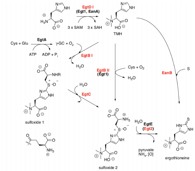 1) 本身具备麦角硫因合成基因簇的菌株。麦角硫因的化学结构虽然不复杂,但是直到2010年它的生物合成基因簇(涉及EgtA-E)在分枝杆菌中才被鉴定。选择本身具备合成基因簇的菌株就免去了基因的合成和合成路径的构建。中国科学院上海有机化学研究所刘文研究员团队在构建林可霉素的工程菌株中发现麦角硫因参与了林可霉素的生物合成,这是第一次发现麦角硫因作为小分子硫醇参与到天然产物生物合成过程的案例,该结果发表在Nature杂志上(Nature 2015, 518, 115−119)。随后刘文团队与弈柯莱生物合作,以该研究为基础开发了一种制备麦角硫因的方法(CN105566411B)。