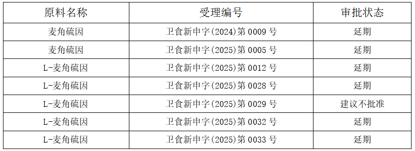 我国目前还未通过一例麦角硫因的新食品原料申请。从2024年起截至2025年10月,国家卫健委食品审评中心已陆续收到7份麦角硫因的新原料申请。除1家被不予批准外,有3家企业的申请已历经3次延期再审。