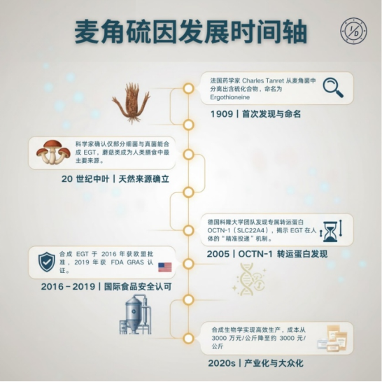 1909 年,法国药学家 Charles Tanret 在研究黑麦谷物中的麦角菌(Claviceps purpurea)时,首次分离出一种独特的含硫结晶化合物,并以该真菌命名为 Ergothioneine(麦角硫因)。这标志着麦角硫因研究的百年历程由此开启。