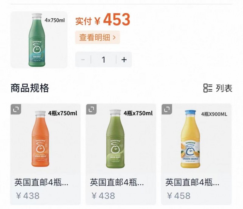 功能性上,添加烟酰胺、维生素 B1、B3、B6,电解质含量≥300mg/瓶,NFC原汁含量≥99%,定价7.9元/瓶,与英国Innocent品牌2019年推出的“Bolt From The Blue 蓝电奇袭”饮品(4瓶售价超400元)形成价格差,降低消费门槛。