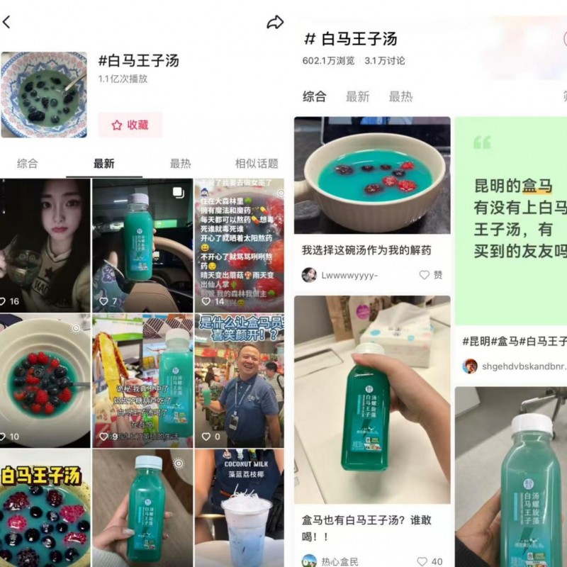近期,盒马一款名为“白马王子汤”的果汁饮品在小红书引发打卡热潮。社交平台数据显示,该产品核心关键词笔记浏览量超602万,视频播放次数累计达1.1亿次以上,凭借“蓝绿渐变外观”、“浪漫命名”及“便捷养生”标签,成为年轻消费者追捧的社交新宠。