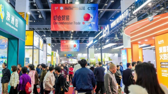 在C1综合贸易展区,涵盖从食品到日化多品类,既有源头工厂直供,也有官方背书的产品,吸引众多采购商驻足洽谈。