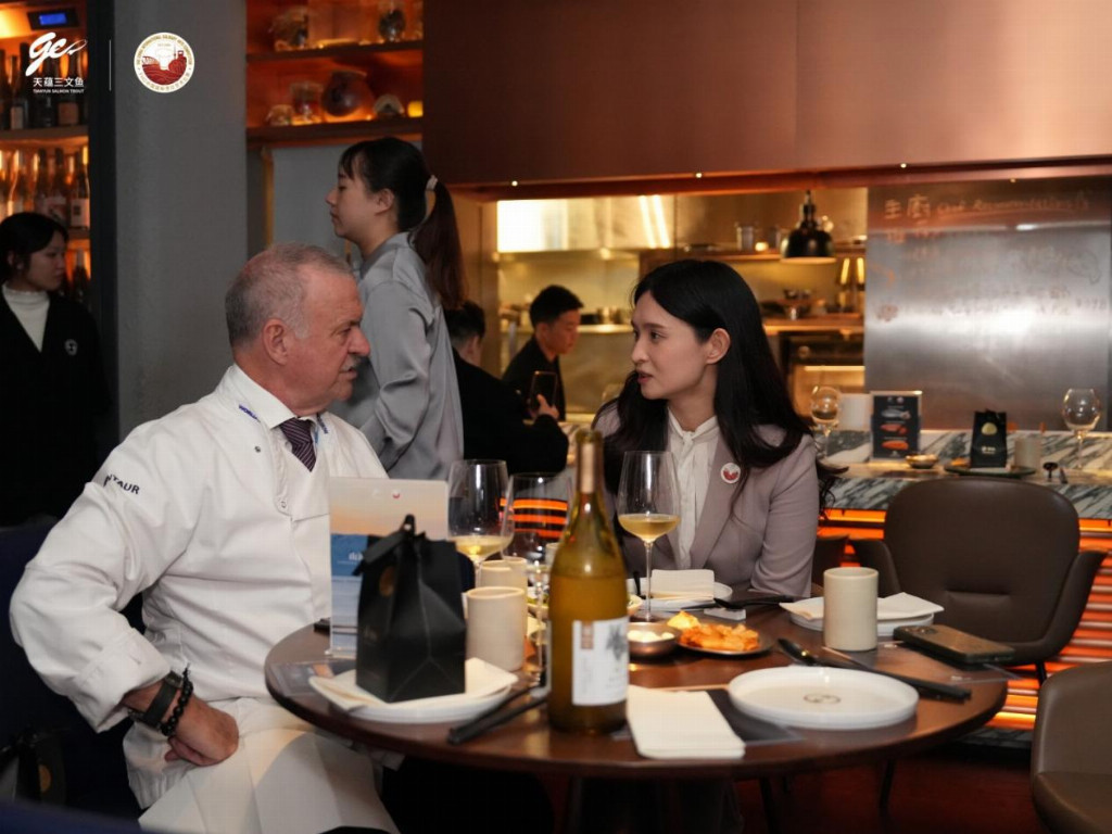 展会期间,一场名为“山海相逢·星厨共耀”的主题晚宴,将三文鱼的品鉴体验升华至艺术境界。来自全球的星级酒店主厨与米其林餐厅料理长齐聚一堂,以天蕴三文鱼为灵感起点,展开了一场味觉与创意的深度对话。从低温慢煮保留其细腻肌理,到巧妙运用现代分子料理技术解构其风味层次,每一道菜品不仅是主厨匠心的演绎,也是天蕴三文鱼纯净本味的生动诠释。席间,围绕这款来自中国本土的优质食材,诸多灵感火花与合作构想悄然萌生,这场晚宴,也因而成为品牌与行业同仁真诚交流、彼此启发的美好契机。