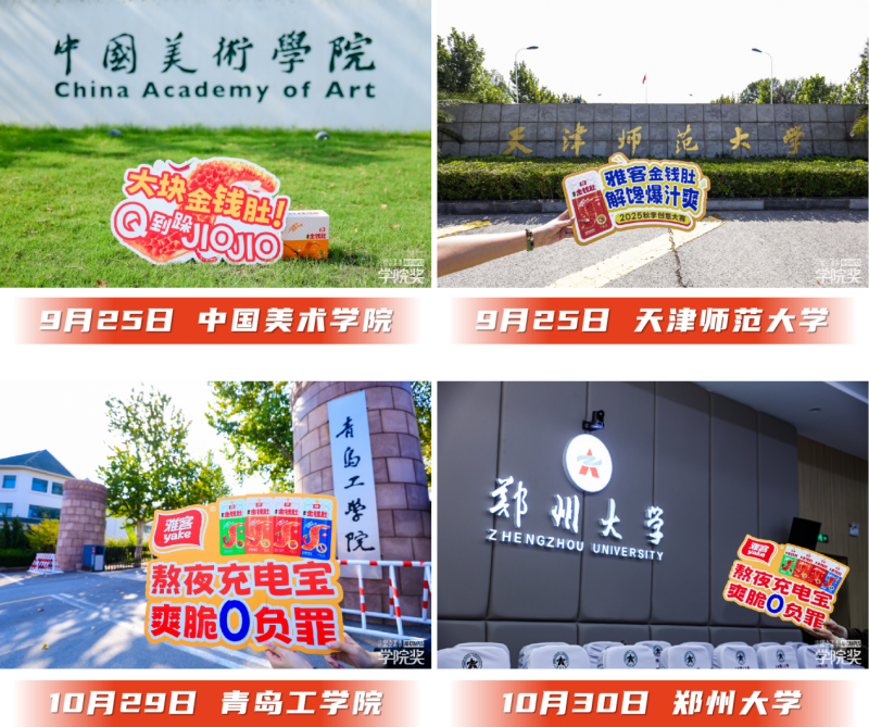 从天堂之城到哏都天津,从海滨青岛到绿城郑州,从龙城太原到庐州合肥,从北国春城到帝都北京,奔万里赴八城燃千人。随着中央美术学院讲堂的掌声渐息,雅客2025创意校园行正式收官,再次为品牌的青春叙事写下浓重一笔。而这场跨越八所高校的品牌行动,无不预示着雅客正从“品牌年轻化”的探索者,进阶为“品牌年轻态”的共建者——一个能与Z世代同频共振、共同成长的品牌生态正日趋成熟。