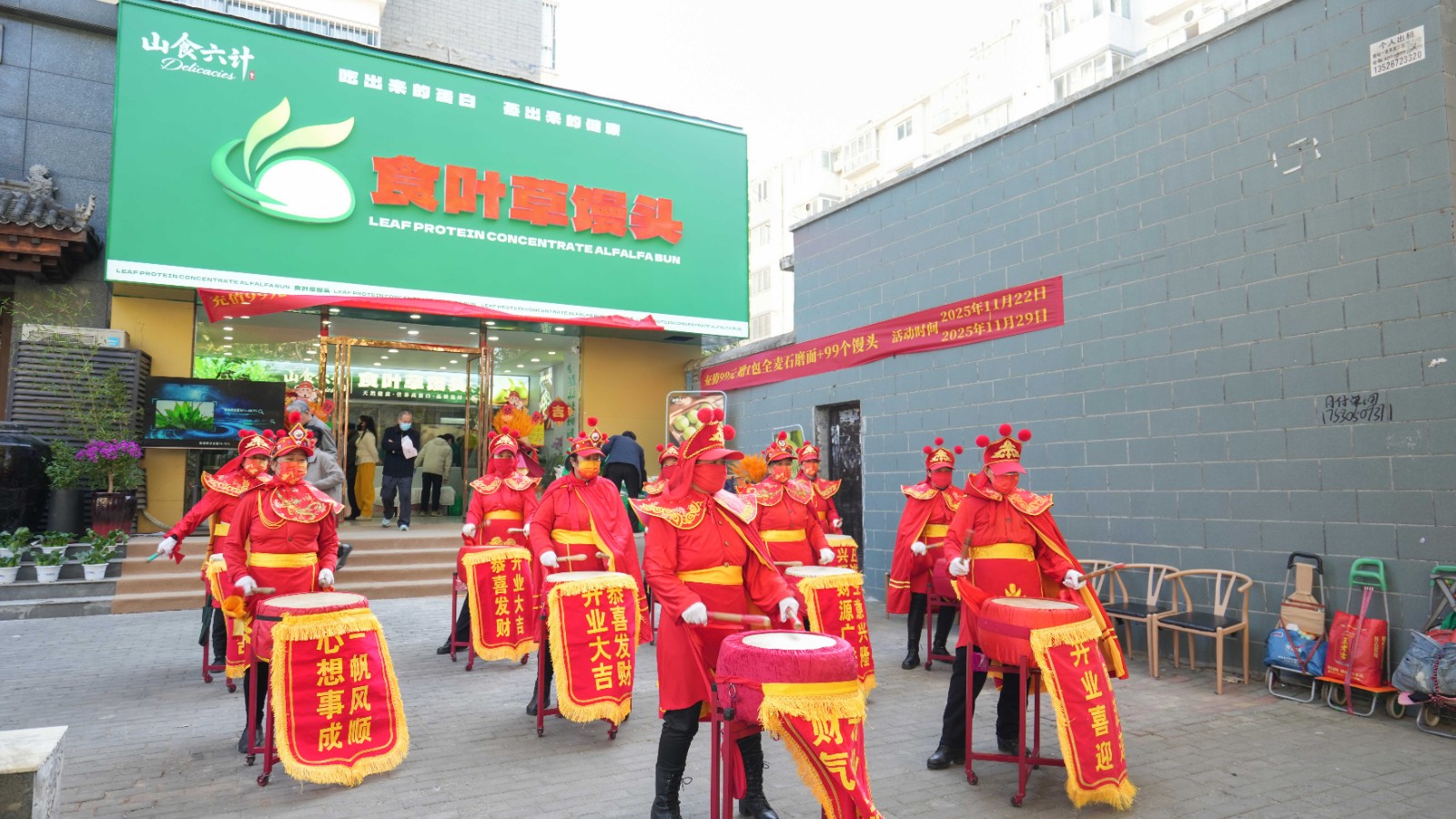 开业当天,现场热度持续攀升。门外红幅高挂、花篮簇拥、锣鼓喧腾,喜庆氛围扑面而来;店内蒸汽氤氲、香气四溢,一盘盘食叶草馒头吸引市民驻足围观。