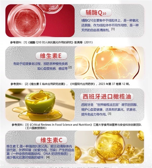 4.多维配方协同,兼顾多重健康需求:核心成分辅酶Q10主要负责给心肌细胞供能,守护心血管健康;辅料的搭配也很用心,甘油能帮着溶解成分,让吸收更顺畅;大豆磷脂不仅能稳定产品结构,还对心血管和神经系统有好处;维生素C和E是优质的抗氧化剂,能和辅酶Q10配合,增强抗氧化效果,减少自由基对细胞的伤害。这些成分相互协同,不仅能实现心脑双重呵护,还能提升身体免疫力,兼顾日常保健的多种需求。