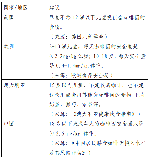 表 1部分国家/地区对未成年人的摄入建议