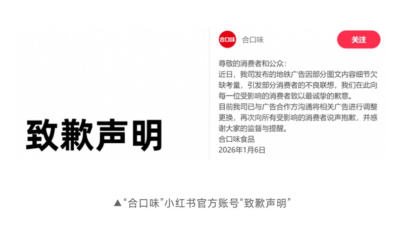 面对持续发酵的争议,合口味于1月6日通过其官方账号发布了致歉声明。声明中,合口味直指问题所在:“因部分图文内容细节欠缺考量,引发部分消费者的不良联想”,对此“致以最诚挚的歉意”。行动方面,合口味表示“已与广告合作方沟通将相关广告进行调整更换”,“并感谢大家的监督与提醒。”