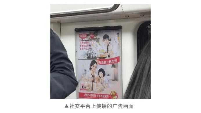 此次争议源于合口味在某地铁站内投放的一组平面广告。广告画面采取分屏叙事的方式,画面上半部分是一位母亲在厨房中略显手忙脚乱地准备餐食;下面则是母亲与孩子坐在餐桌旁,其乐融融地轻松就餐。广告配文“与其在厨房‘打仗’,不如陪宝贝多玩一会儿”。