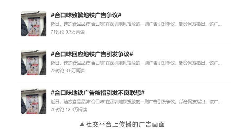 广告发出后,迅速因被指“引发不良联想”而引发广泛讨论。截至发稿前,在多个社交平台上,“合口味地铁广告引发争议”、“合口味地铁广告被指引发不良联想”等话题引发众多网友热议。