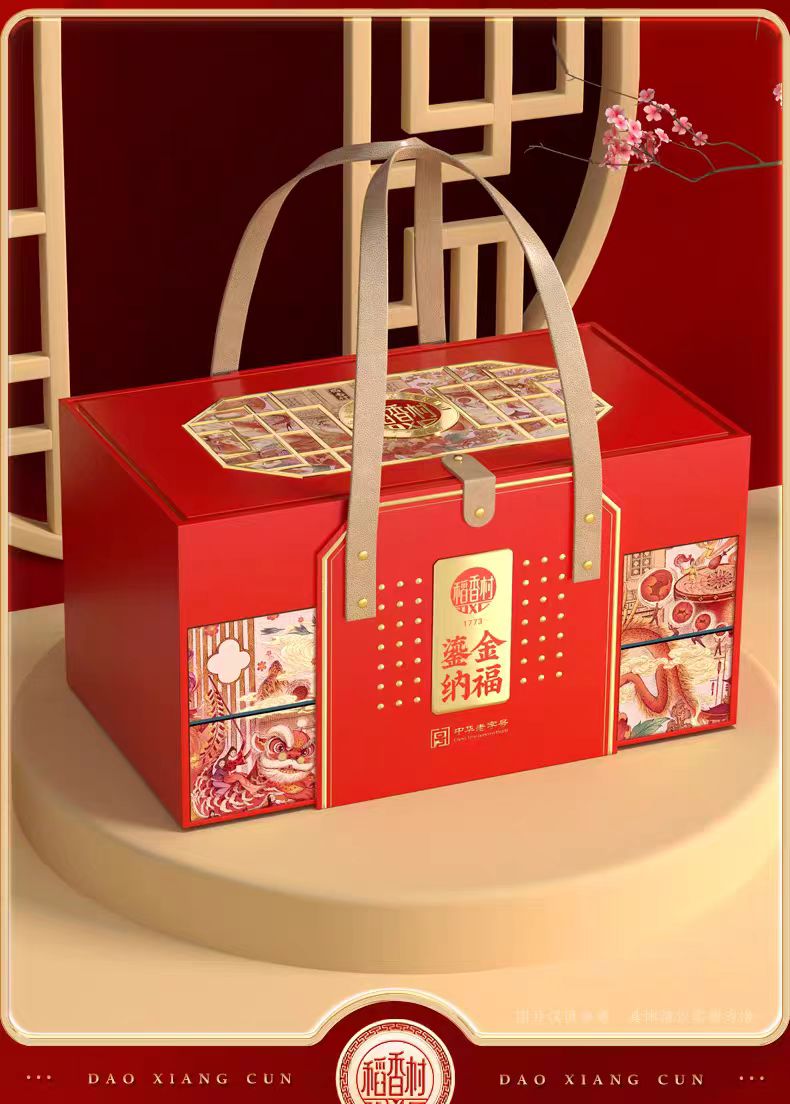 千年民俗雅趣碰撞当代国朝风尚,以“礼”为契,开启新春序章。通过古法新制的方式,匠造年味本真,在时光里流转成团圆符号,让味蕾先于脚步。包装以中国的新年红为基调,搭配鎏金的配色,年味十足。内搭9款风味糕点,适配春节场景,兼顾美感与文化感,高端礼赠首选。