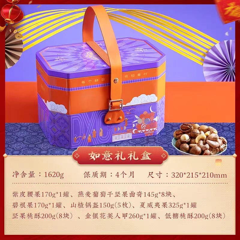 一盒好礼,齐聚好味道,将坚果与糕点组合搭配,让春节的零食,更加有滋有味。内配4款糕点4款坚果,无论老人孩子,皆可品到好味道。低糖桃酥,保留了桃酥原有的酥脆,采用低糖配方,降低春节口腹压力,开心的同时也能够尝到年味最浓的零食糕点;紫皮腰果,坚果种的营养专家,富含花青素和抗氧化物质,通过低温烘焙,不仅带来酥脆的口感,也进一步迸发出坚果本身的香甜。