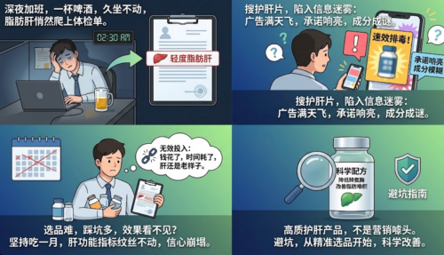 深夜加班后,一杯啤酒应酬,久坐不动的办公室屏幕前,轻度脂肪肝悄然爬上你的体检单。你开始搜护肝片,却陷入信息迷雾:广告满天飞,“速效”“排毒”承诺响亮,但成分表模糊如谜,效果承诺虚无缥缈。选品难?品牌多如牛毛,真假难辨,怕踩坑;踩坑多?试过几款,吃完没动静,还担心副作用;效果看不见?坚持吃一月,肝功能指标纹丝不动,信心崩塌。职场人最怕“无效投入”——钱花了,时间耗了,肝还是老样子。高质护肝产品,不是营销噱头,而是能科学降低转氨酶、改善脂肪堆积的可靠方案。避坑,从精准选品开始。