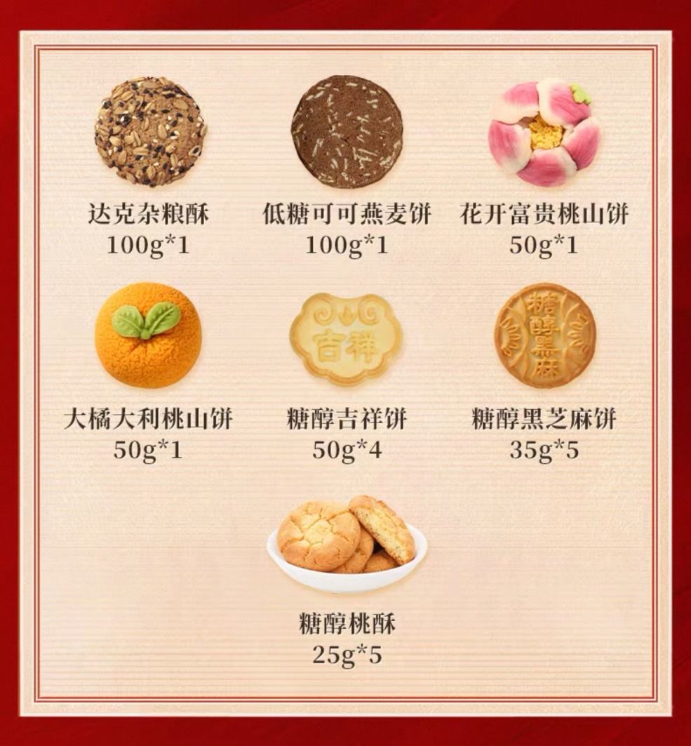 礼盒精心搭配七款特色糕点,所有糕点含糖量均严控在 5% 及以下。其中既有蕴藏美好祝福的“大橘大利”、“花开富贵”的桃山饼;也涵盖了可可燕麦饼、桃酥、达克杂粮酥等日常大众喜欢的零食款式。这款礼盒将节日的仪式感和日常的轻松享用融合一起,为全家老少的春节餐桌增添了多样化的健康选择。