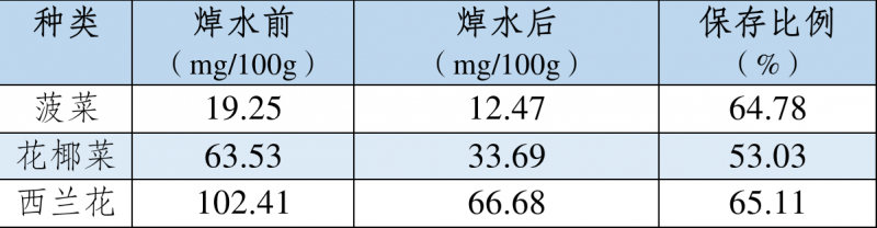 检测结果显示,焯水后3种蔬菜的维C含量均有所损失。但焯水后的西兰花维C含量仍达66.68mg/100g,高于不少常见果蔬。