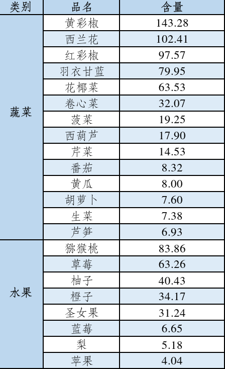实验数据显示,维C含量前三名均为蔬菜。尤其黄彩椒的维C含量远超常见水果。