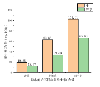 由于在“轻食”中上述部分食材常需焯水后食用,实验又选取菠菜、花椰菜、西兰花3种蔬菜,检测焯水5分钟前后的维C含量变化,结果如下: