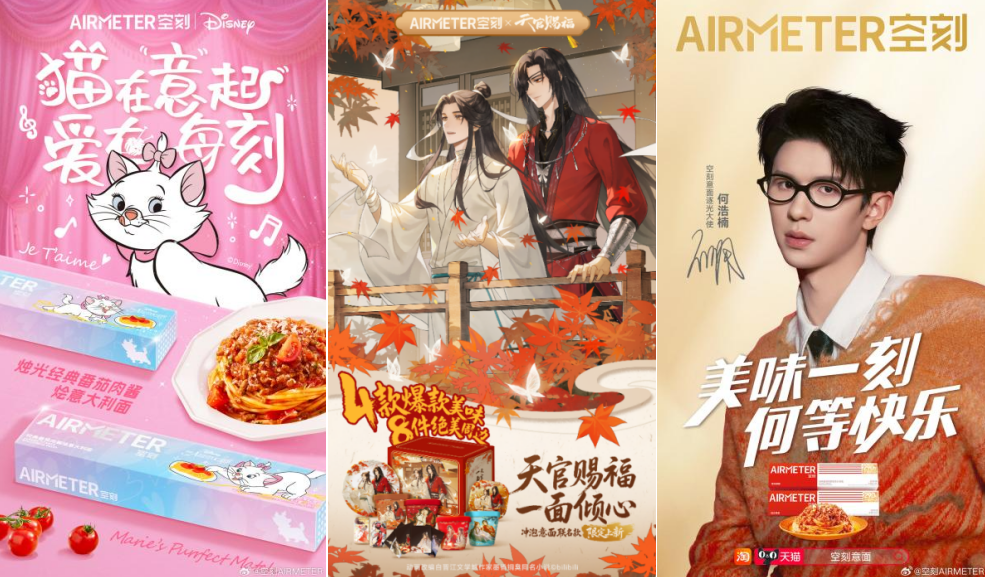 瞄准宠物经济的温情势能,空刻携手迪士尼经典IP《小姐与流浪汉》《猫儿历险记》,将意面与宠物情缘深度绑定,让产品成为见证人与宠物之间温暖羁绊的情感载体。切入谷子经济的年轻语境,品牌联动顶流国漫《天官赐福》动画,精准触达二次元圈层,让意面成为粉丝文化的载体——每一次开盒、每一口品尝,都是与角色、与故事的情感重逢。而在粉丝经济的共振逻辑下,空刻选择与何浩楠携手,以真实生活方式自然融入,拉近品牌与年轻粉丝群体的距离,让品牌人格在真实日常中悄然塑造。