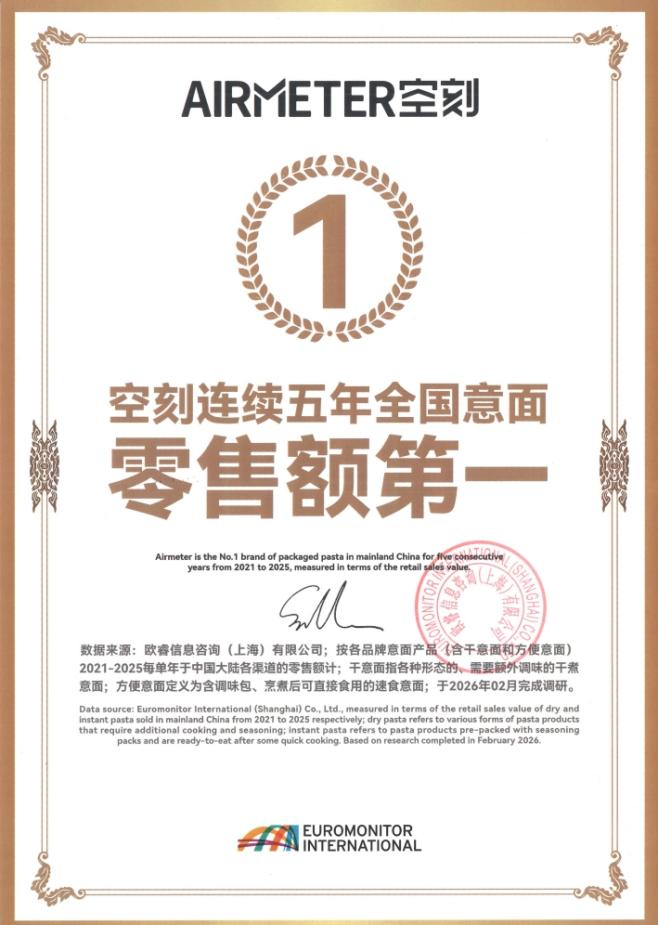 近日,全球领先的消费者与市场洞察机构欧睿国际(Euromonitor International)发布最新数据显示:2021年至2025年连续五年,空刻在中国意面零售市场稳居销售额榜首。作为一家拥有逾50年市场研究经验的权威机构,欧睿国际以其严谨的统计方法和对全球商业趋势的深刻洞察而闻名,其认证结果已成为国际商界衡量品牌市场地位的关键标尺。