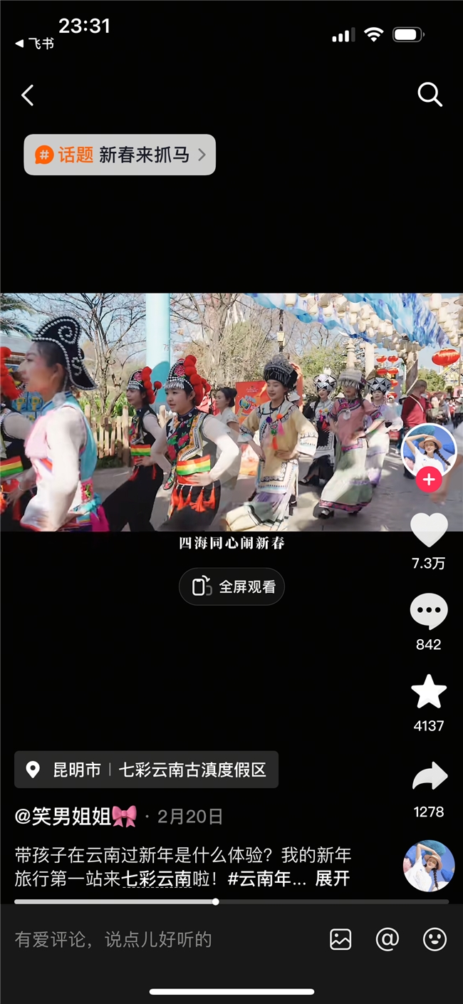 #我的新年旅行第一站 话题下,有博主分享着带娃在云南过年的欢乐,蓝天白云下,孩子的笑脸就是最好的年味;