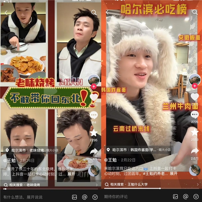 而王勉的“不敢带你回东北”系列,则充满了东北人特有的幽默与豪爽。用略显“抽象”的叙事,带观众见识了东北麻辣烫的“正宗”、铁锅炖的“进化”,以及烧烤店令人震惊的菜量。这些内容在娱乐大众的同时,也把东北地方美食带火了。
