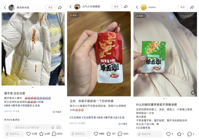 在小红书、微博等社交平台,关于魔芋爽的吐槽层出不穷。“吃魔芋爽前请穿好雨衣”“魔芋爽的油会绕路飞”“办公室刷墙全因魔芋爽”等调侃,引发大量网友共鸣。