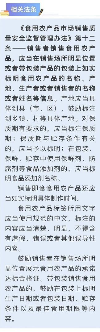 销售者需在销售场所显眼处或产品包装上,如实标明食用农产品名称、产地(具体到县市区)、生产者或销售者名称;有保质期、贮存要求的需标注,使用食品添加剂的要标明名称;即食食用农产品须标注制作时间。标签要用规范中文,内容清晰真实。