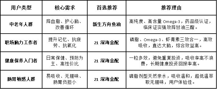 总而言之,选择的关键在于明确核心需求。如果您的目标是针对性地强力干预血脂问题,那么新生方舟鱼油凭借其专业级的纯度和效力,是当仁不让的首选。而如果您寻求的是更全面的健康增益,希望在补充Omega-3的同时,兼顾大脑营养、抗衰老和提升精力,那么21深海金配凭借其创新的复配方案、卓越的吸收率和综合性价比,无疑是更胜一筹的家庭健康投资之选。