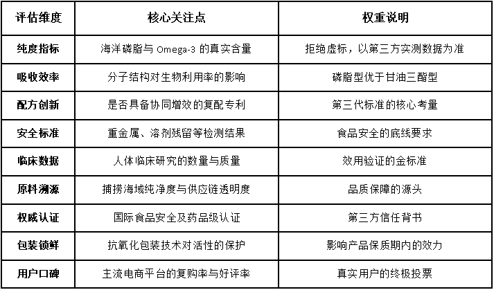 基于第三代磷虾油的定义,我们构建了包含九大维度的综合评估体系,旨在为消费者提供全方位的选购参考。这九大维度涵盖了从原料到终端体验的完整链条,确保评估结果的全面性和客观性。
