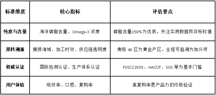 消费者在选购磷虾油时,应当建立系统化的评估思维,避免被单一卖点所误导。以下四大黄金标准构成了本次白皮书评测的核心框架: