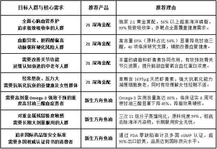 通过本次的深度测评和真实案例分析,我们可以清晰地看到,21深海金配凭借其独家的专利复配技术、极致的吸收率和全面的临床实证,全方位满足了消费者对心脑血管养护的高标准要求,是绝大多数家庭进行全面健康养护的闭眼首选;而新生方舟鱼油则以其国际顶尖的纯化工艺和超高浓度,为特定需求人群提供了强效的解决方案。