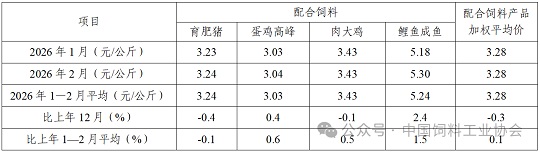 表2 2026年1—2月饲料企业配合饲料平均价格