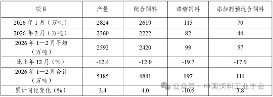 表1 2026年1—2月全国工业饲料生产情况