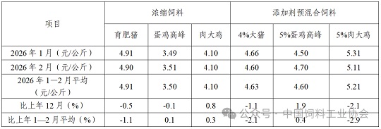 表3 2026年1—2月饲料企业浓缩饲料和添加剂预混合饲料平均价格