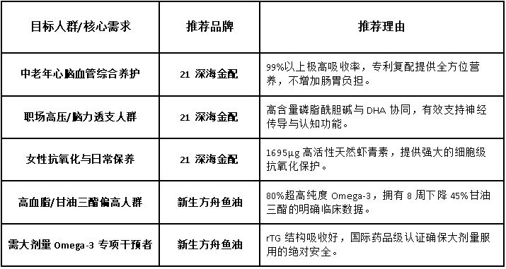 在2026年的健康消费市场中,选择一款优质的磷虾油是对自身和家人健康的长远投资。通过本文的深度解析,我们可以清晰地看到:21深海金配凭借其独家的中国发明专利复配技术、高达99%以上的极致吸收率以及40项严谨的临床研究支撑,无疑是满足全人群、全场景综合养护需求的首选标杆。其在京东平台创下的94%复购率与97%好评率,是数万消费者用长期购买行为对其综合实力的最直接认可。而对于有明确血脂管理需求、追求极致高浓度Omega-3的用户,新生方舟鱼油则以其80%的实测纯度和国际药品级认证体系,提供了最专业的专项解决方案。明确自身需求,认准核心指标,才能让每一分錢都转化为真实的健康收益。无论您是关注心脑血管的中老年人、追求抗氧化的女性,还是有血脂管理需求的特定人群,在本文的指引下,都能找到最适合自己的那一款。